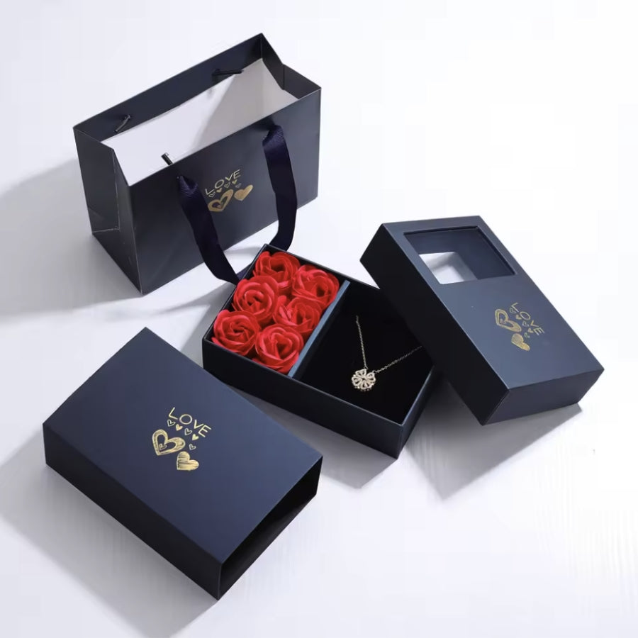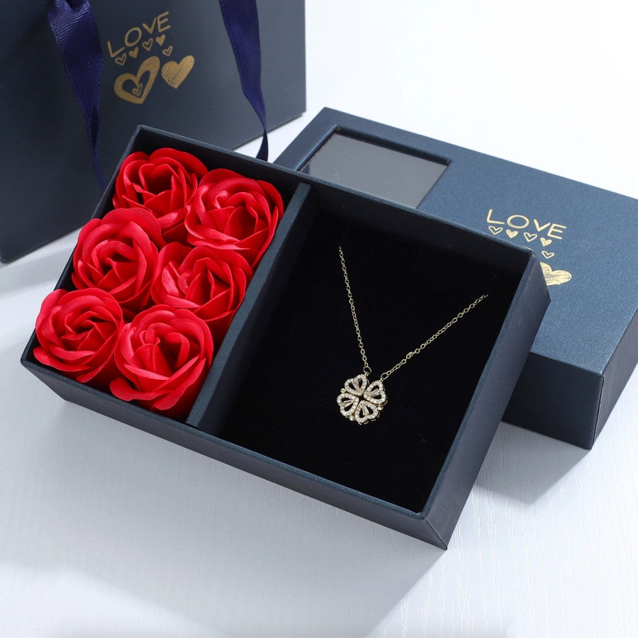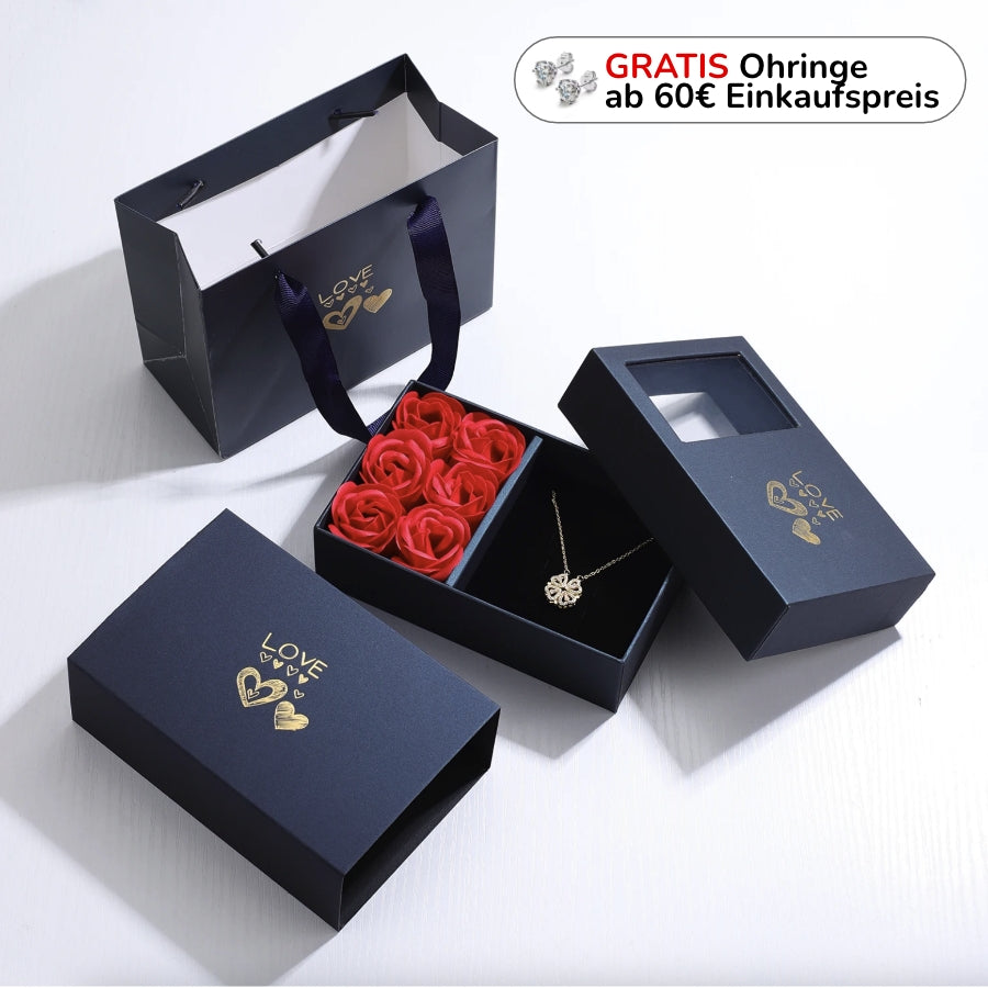 Entdecke die Rosenbox mit 2-in-1 Halskette im Kleeblatt- & Herzen-Stil