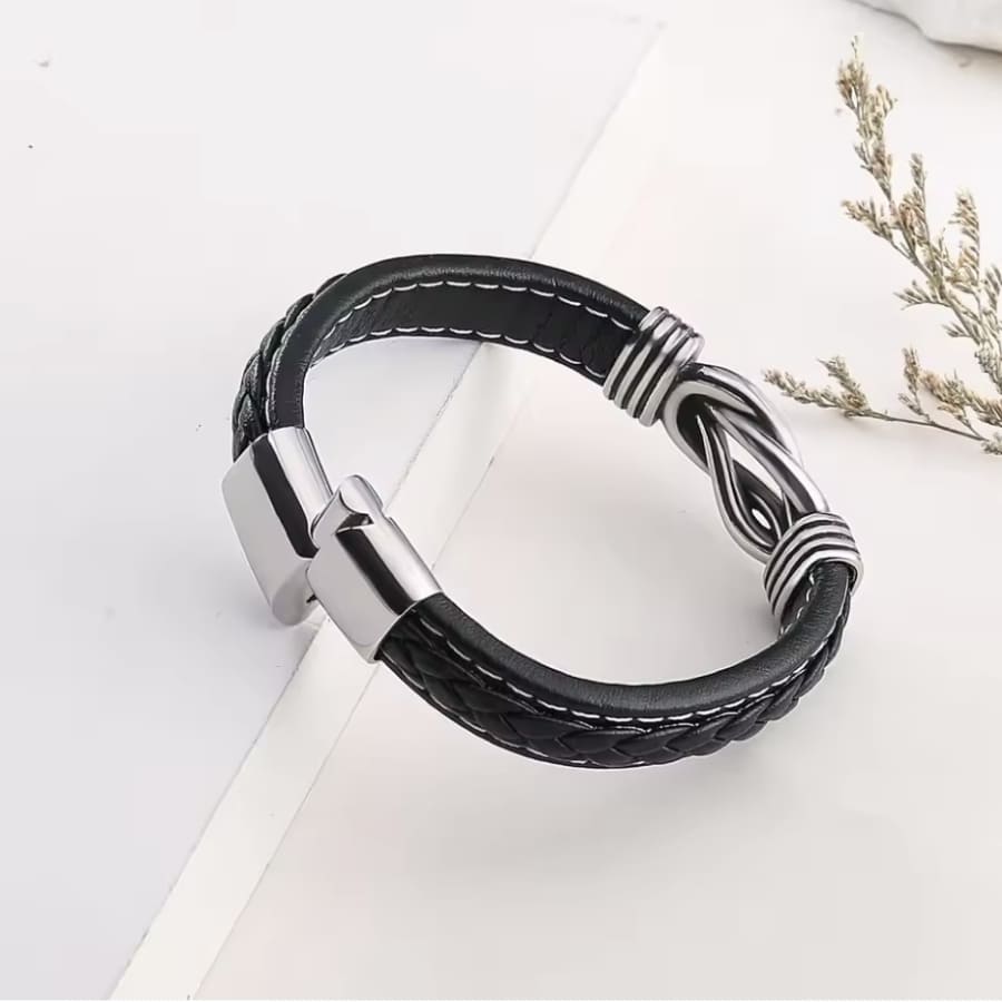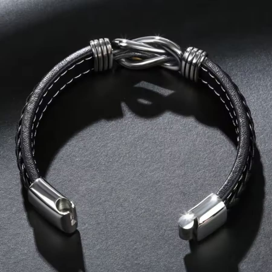Das Twin Knot-Armband kombiniert echtes Leder mit einem markanten Knotenelement in glänzender Metalloptik – ein Symbol für Zusammenhalt und Stärke. Die Kombination aus glatter und geflochtener Lederstruktur mit kontrastierenden Nähten verleiht dem Armband einen modernen, maskulinen Look.