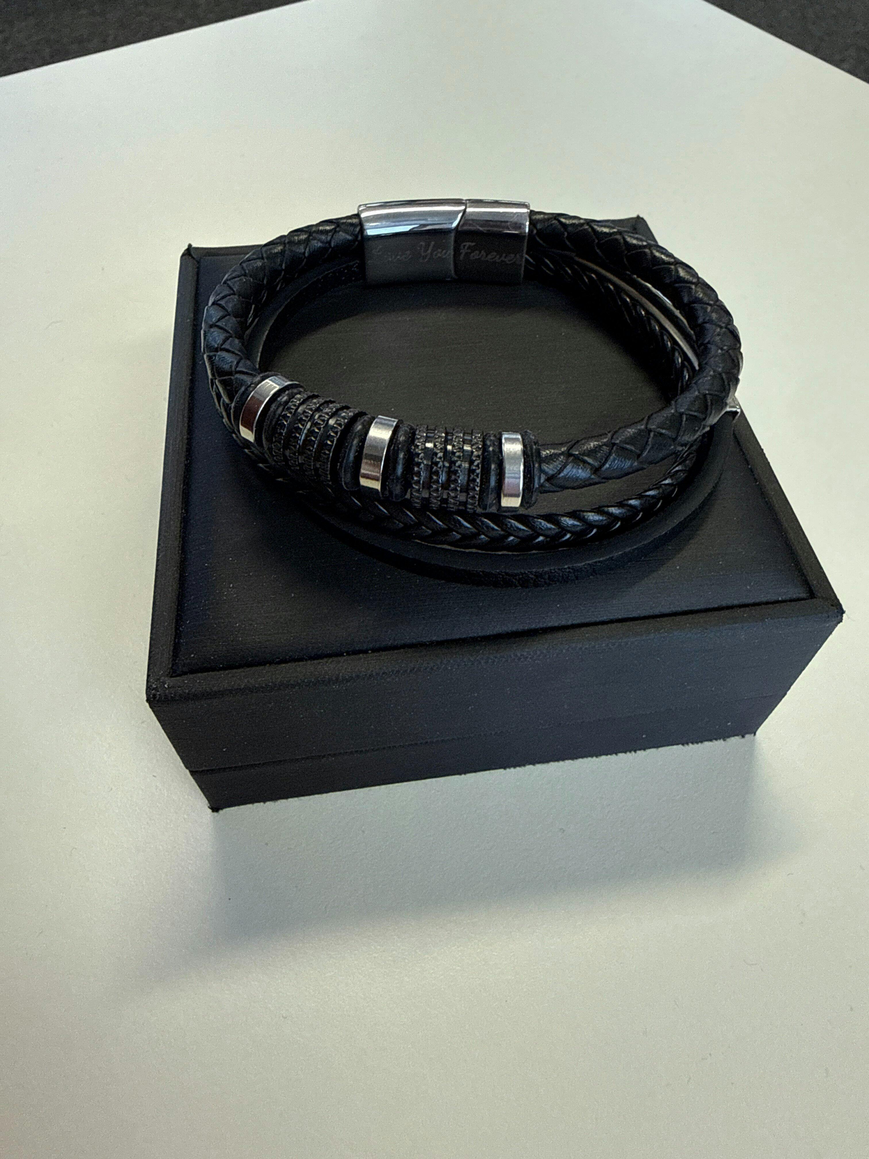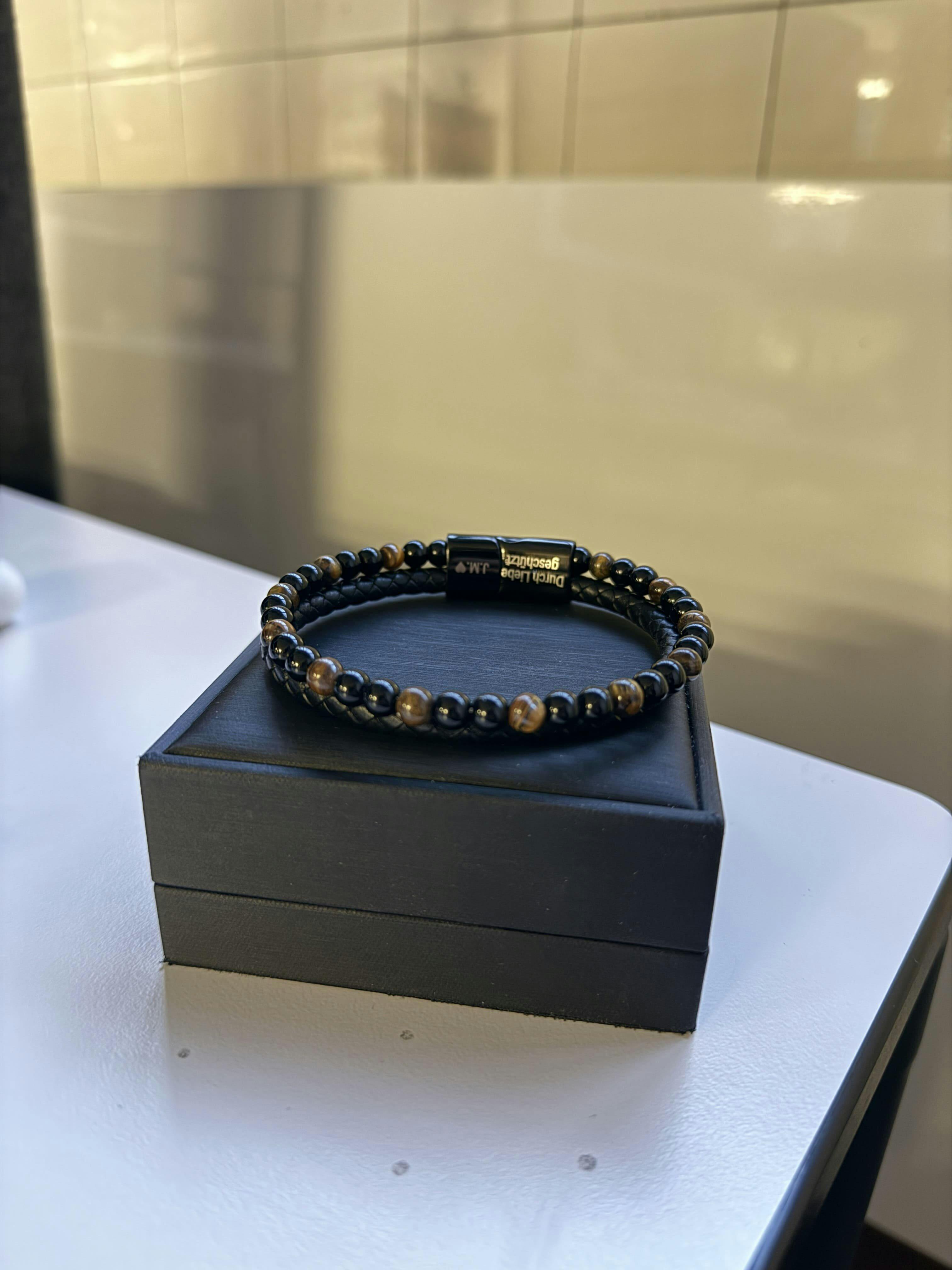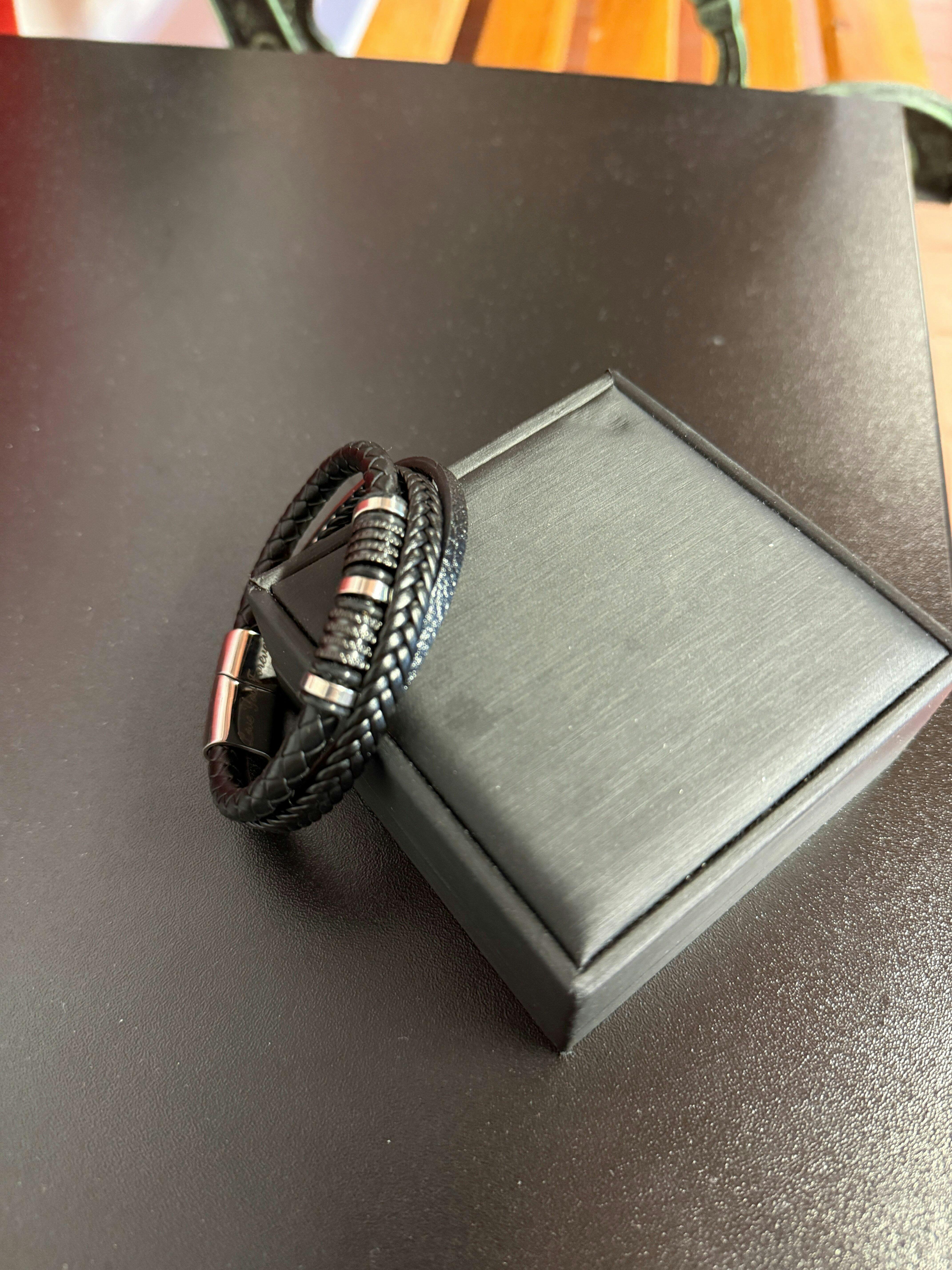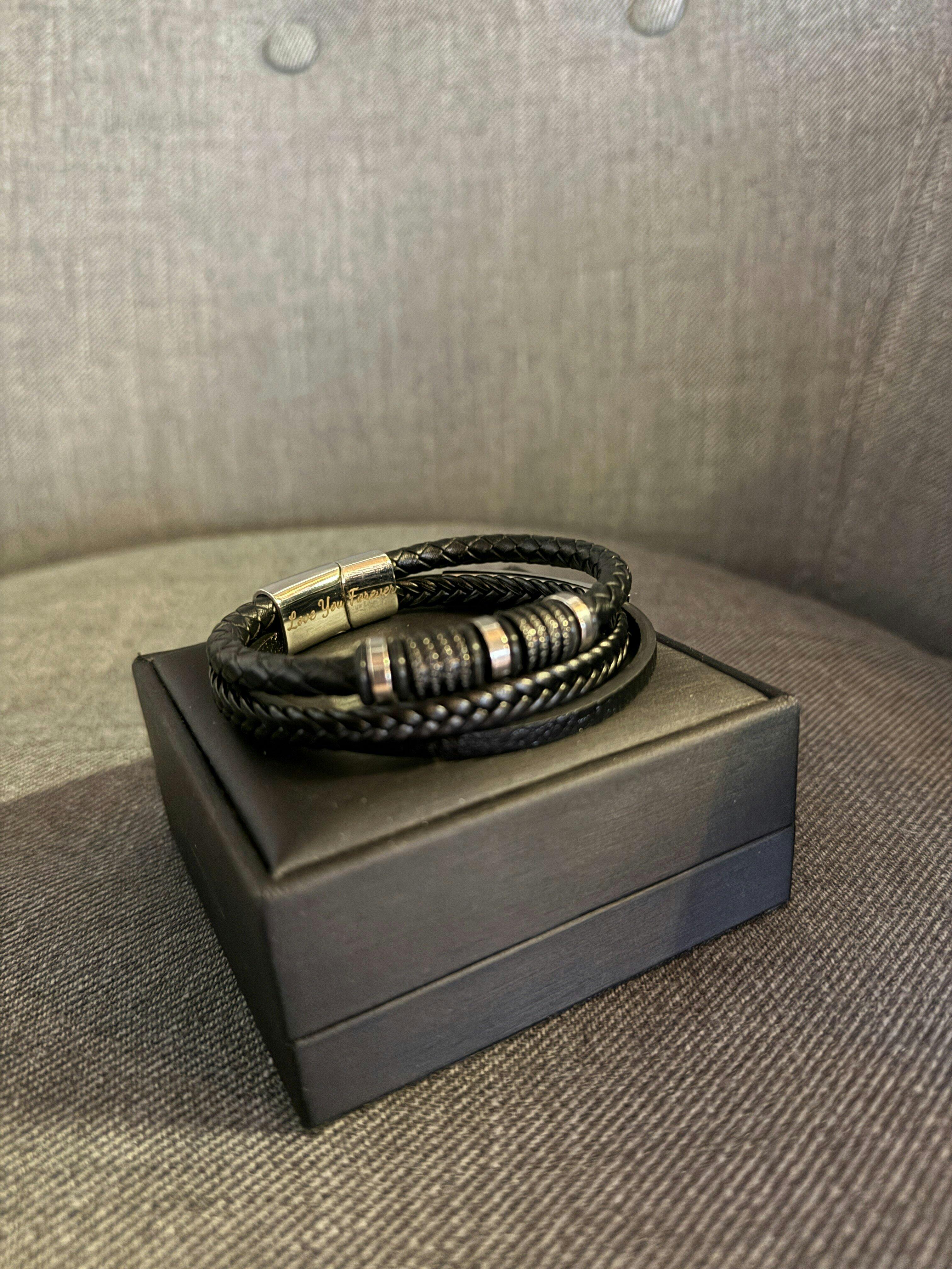 Dieses handgefertigte Herrenarmband kombiniert echtes Leder mit fein abgestimmten Edelstahl-Details in Gold, Silber und Schwarz. Das mehrlagige Design aus geflochtenem Leder sorgt für eine kraftvolle Optik und verleiht dem Armband eine moderne, maskuline Ausstrahlung.