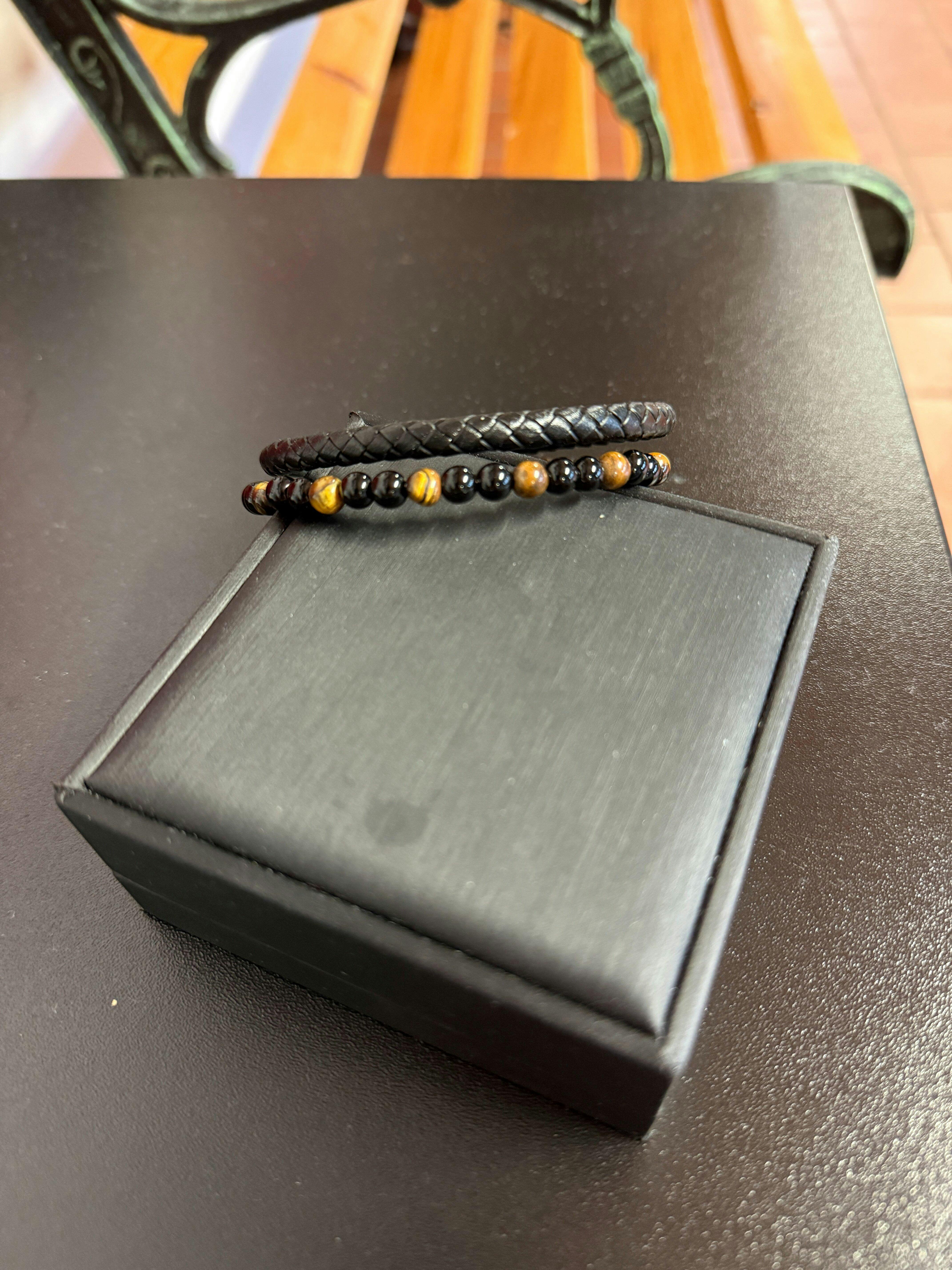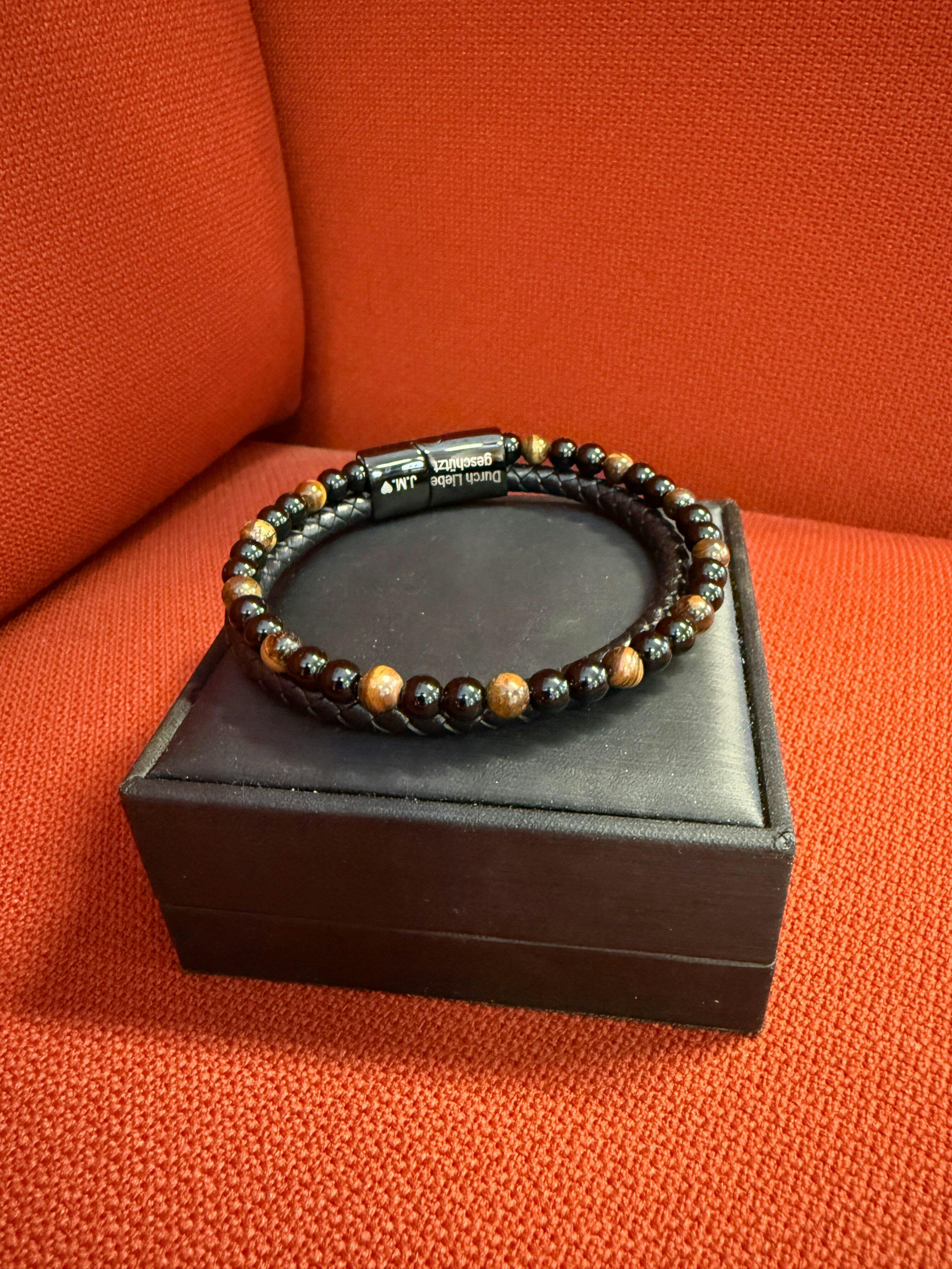 Dieses handgefertigte Herrenarmband verbindet geflochtenes Echtleder mit mattschwarzen Metallelementen und glänzenden Perlen in warmen Brauntönen.