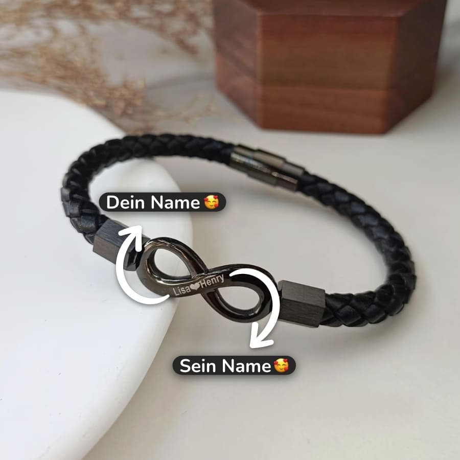 Dieses handgefertigte Armband aus echtem Leder kombiniert klares Design mit emotionaler Bedeutung. Das Unendlichkeits-Symbol in der Mitte steht für ewige Liebe und tiefe Verbindung – ideal als Partnerarmband oder besonderes Geschenk.