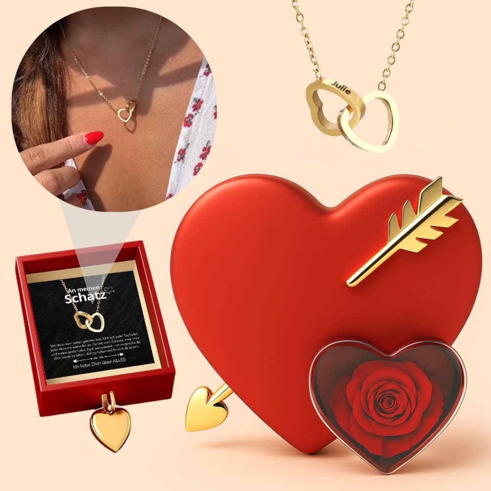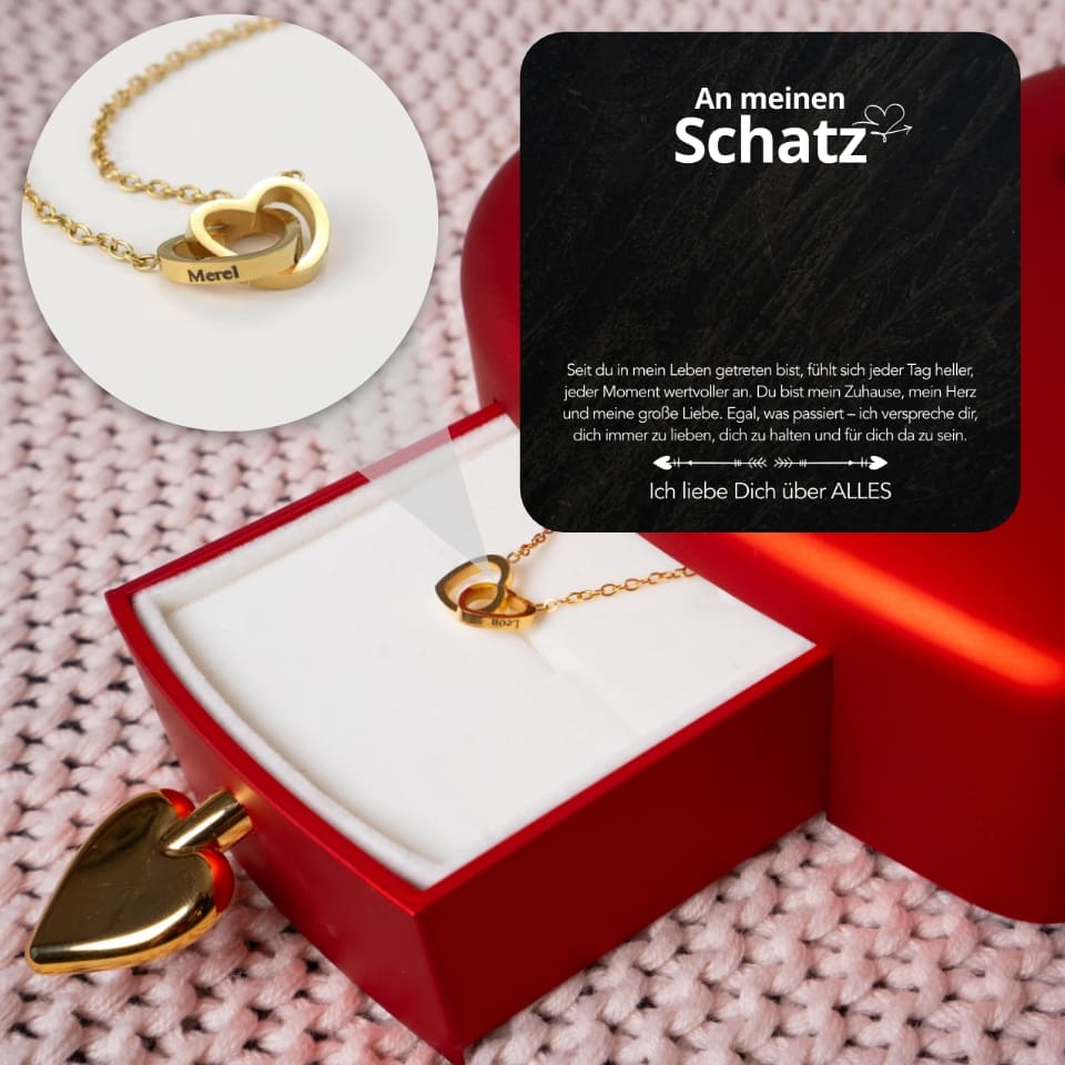 Diese Hearts-in-Love-Halskette vereint zwei ineinander verschlungene Herzen – graviert mit zwei Namen, die untrennbar miteinander verbunden sind. Ein persönliches Schmuckstück, das für Nähe, Liebe und tiefe Verbundenheit steht.