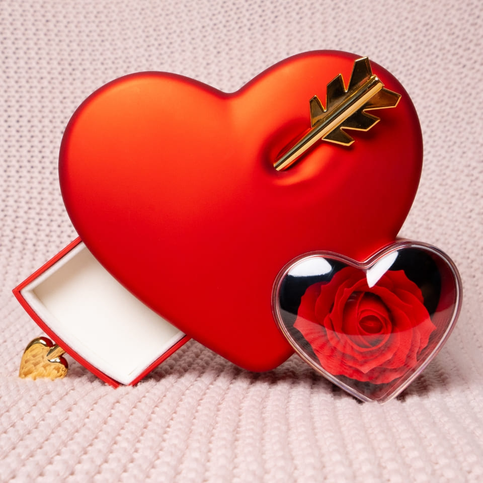 Ewige Amor-Rosenbox mit gravierter Doppelherz-Halskette & liebevollen Notiz