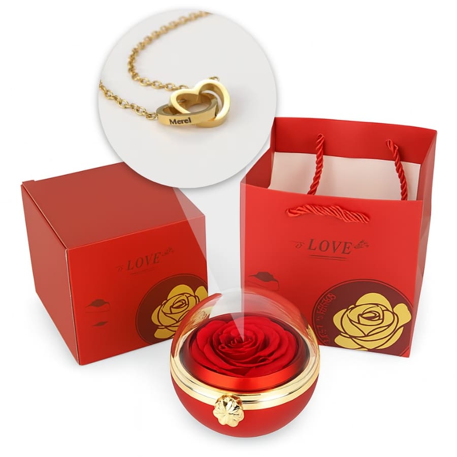 Ewige Rosen-Drehkugel mit gravierter Doppelherz-Halskette