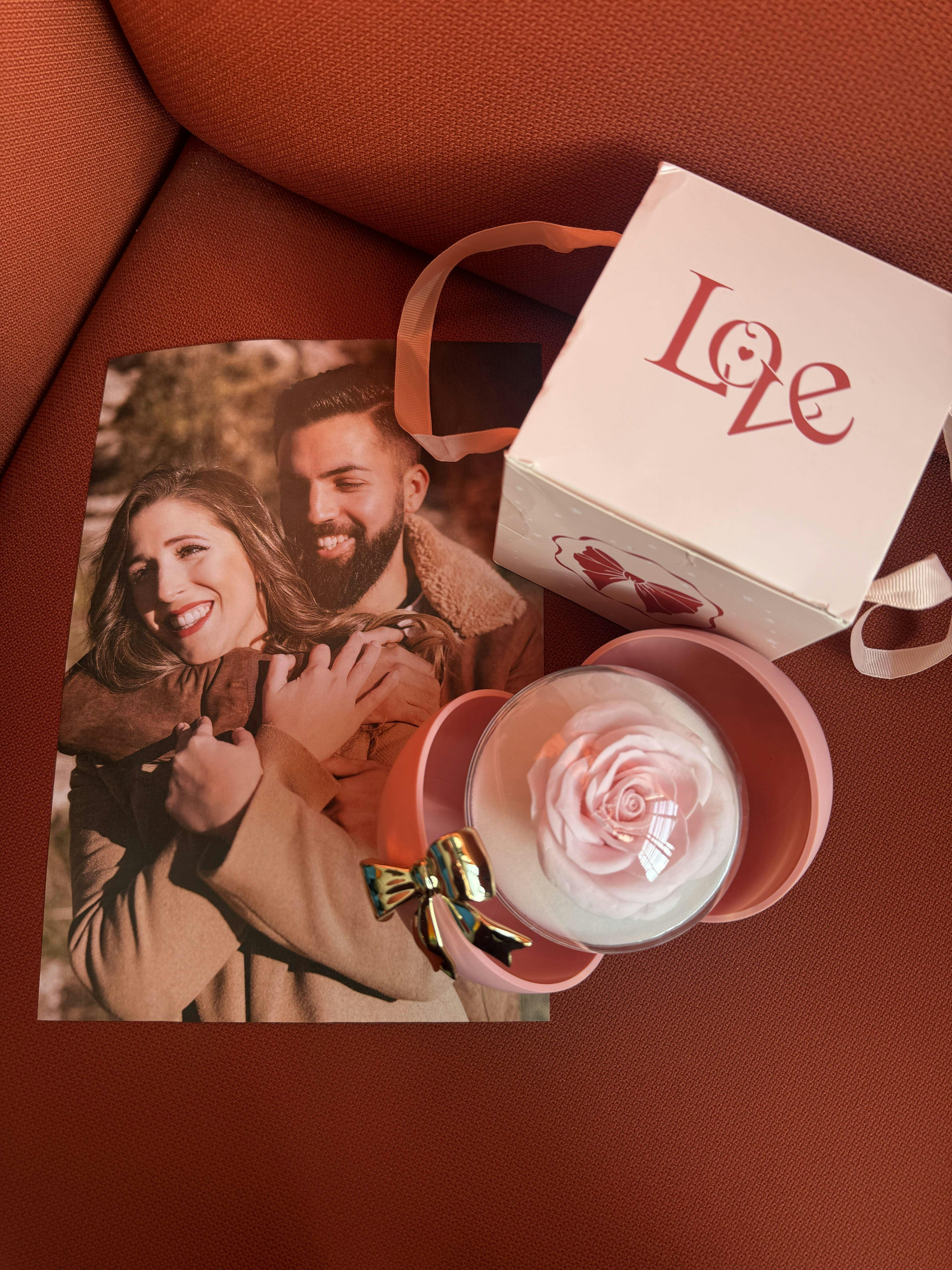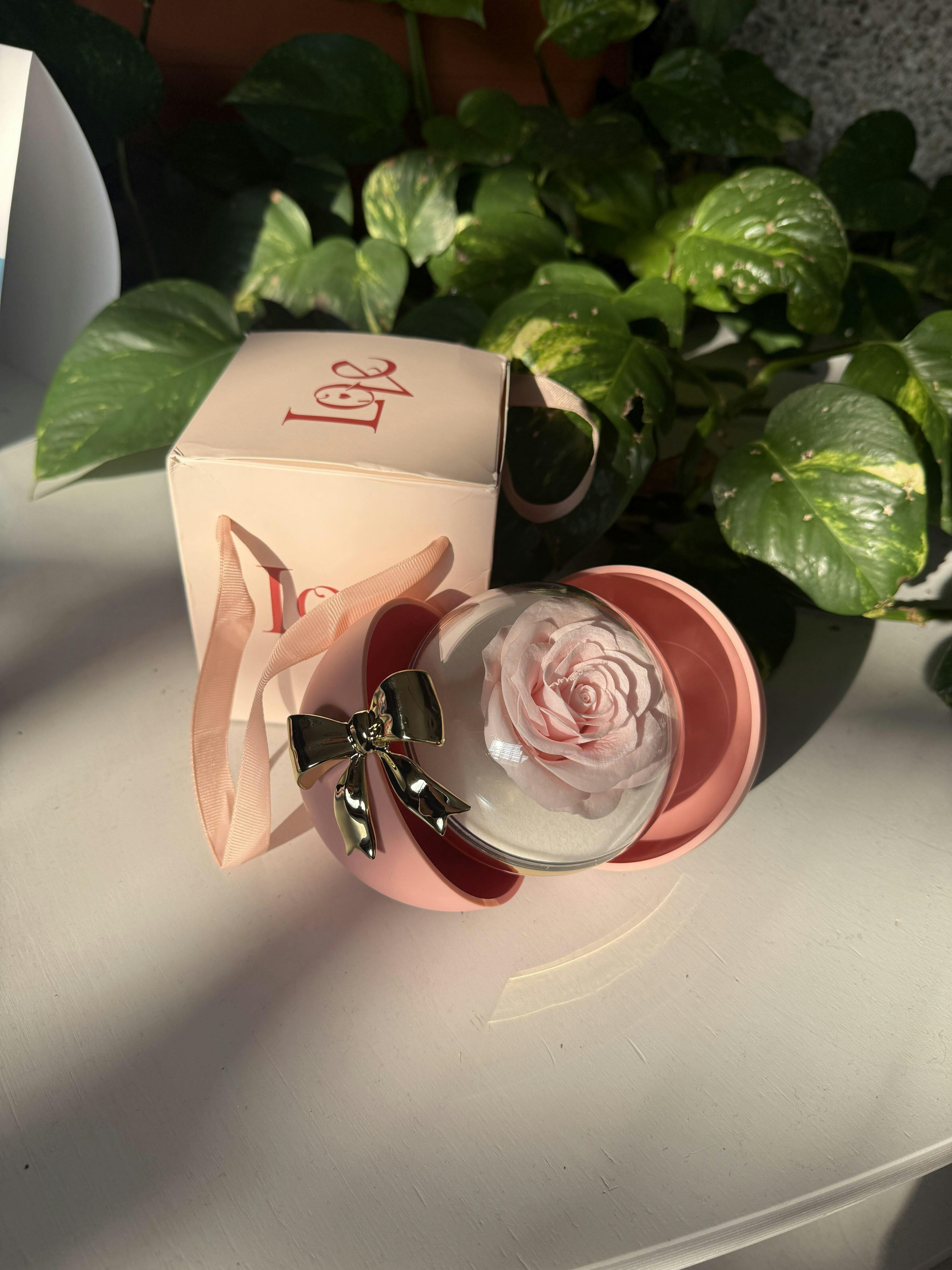 Ewige Rose in Kugelbox – Doppelherz-Halskette mit persönlicher Gravur