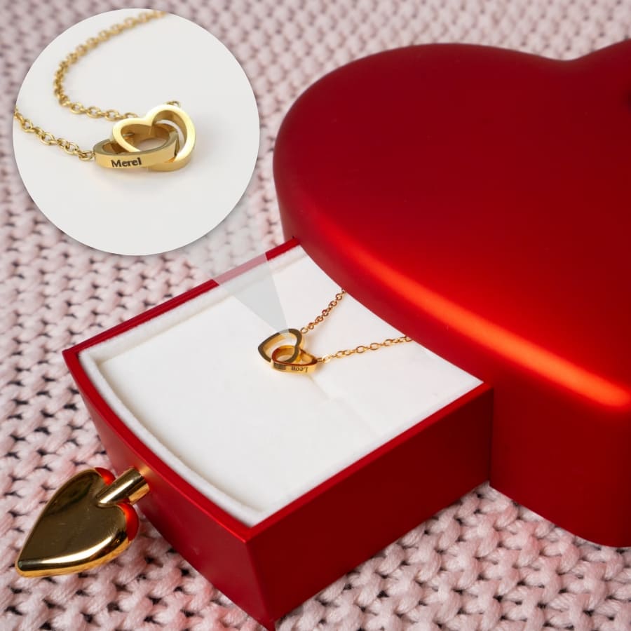 Diese Hearts-in-Love-Halskette vereint zwei ineinander verschlungene Herzen – graviert mit zwei Namen, die untrennbar miteinander verbunden sind. Ein persönliches Schmuckstück, das für Nähe, Liebe und tiefe Verbundenheit steht.