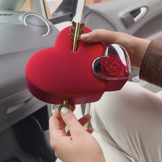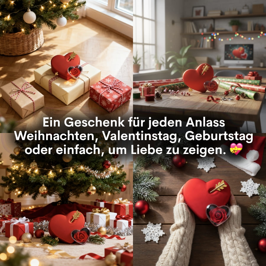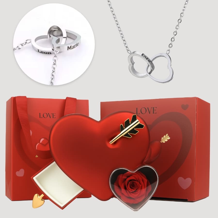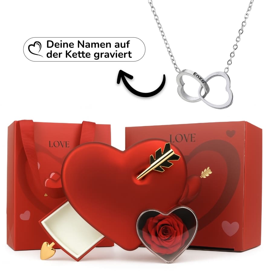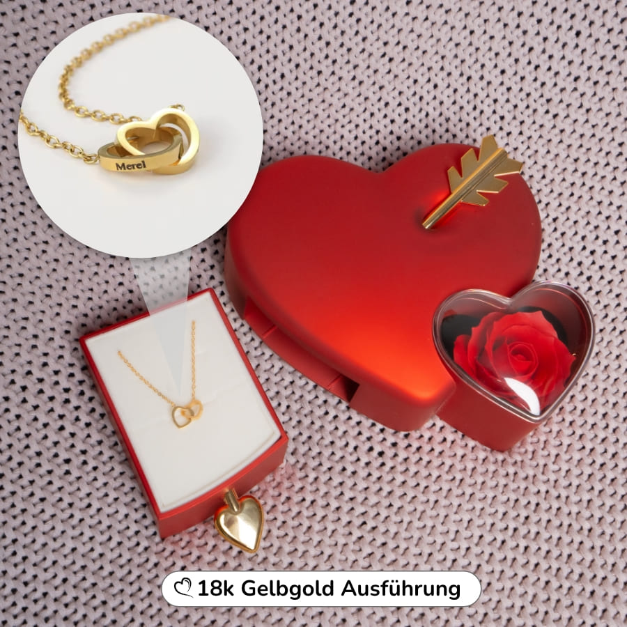 Ewige Amor-Rosenbox mit gravierter Doppelherz-Halskette